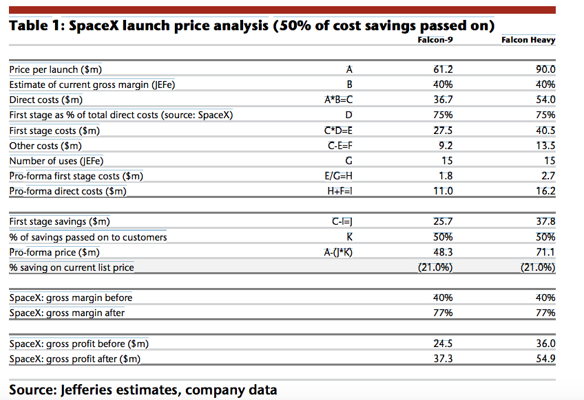 Musk has said the first-stage engine could be reused dozens of times. Jefferies assumes it is used 15 times.